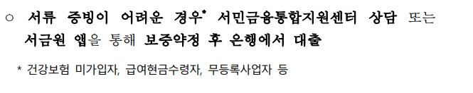 □ (증빙이 어려운 경우) 서류준비가 어려운 건강보험 미가입자,급여현금수령자, 무등록사업자 등은 서민금융통합지원센터 방문