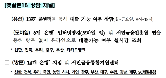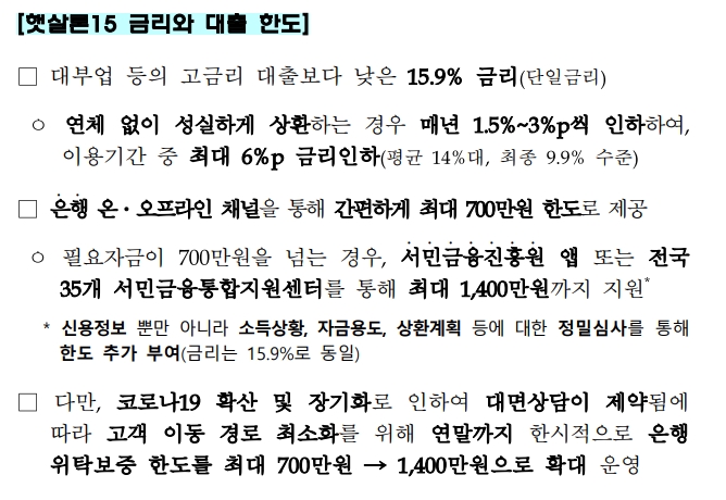햇살론15는?대부업·불법사금융 등 고금리 대출을 이용할 수 밖에 없는 최저신용자가 최소한의 기준만 충족하면 은행 대출을 편이하게 이용할 수 있도록 지원하는 국민행복기금에서 보증 정책