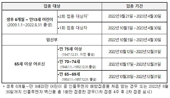 인플루엔자 국가예방접종 대상은 생후 6개월부터 만 13세 이하 어린이, 임신부, 65세 이상 어르신을 대상으로 연령대별로 순차적으로 접종을 시행한다.